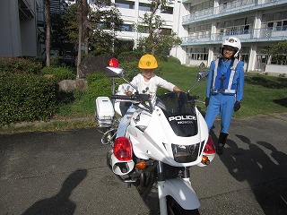 そのあと、1年生は特別に白バイやパトカーに乗せてもらう体験をしました。間近で見る警察車両に目を輝かせ、大喜びの様子でした。