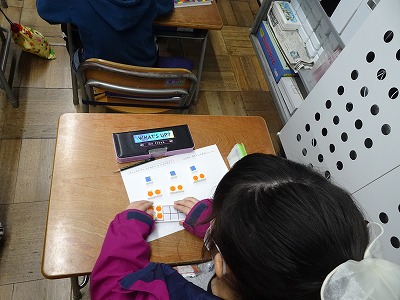 「子どもが3人います。1人に2個ずつあげます。いちごは、全部で何個ですか」の全部の数を求めるやり方を考えました。ブロックや数え棒の道具を使ったり、絵や数字をかいたりして一人一人考えていました。その後は、グループで伝え合いました。しっぴートークのように、相手を見て話したり聞いたりすることができました。それからワークシートを大型テレビに映してもらいながら、みんなに発表しました。どの考えも2こずつのまとまりがあることに気付くことができました。最後は、「今日の授業はわかった」「むずかしかった」「発見した」「次はこんなことするのかな」など授業を振り返りました。