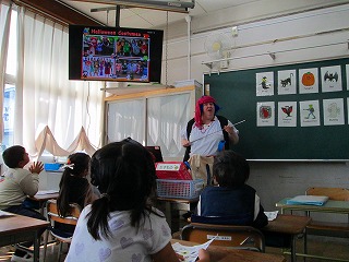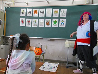 1年生の教室では、ハロウィンの今日、ALTの先生が仮装をして英語の授業を行いました。