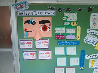 保健室前の掲示板には、保健の先生から子どもたちへ目についてのメッセージが掲示されています。
