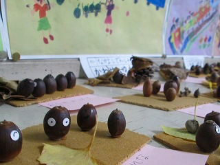 1年生は、生活科「あきとなかよし」で、どんぐりや枯葉などを使って、あきを楽しみました。