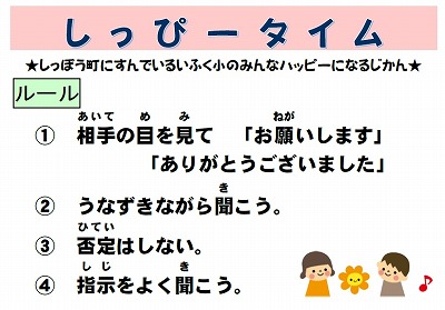 緊急事態宣言が解除され、「しっぴータイム」が始まりました。「しっぴータイム」とは、自分について発見したり、コミュニケーションを身に付けたりすることができるようになることが目的です。今日は、「しっぴータイム」の約束を確認しました。これから、自分について話したり、友達のことを知ったりしていきましょうね。