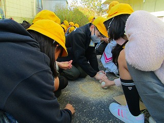 足踏み脱穀機を使って脱穀し、その後は、ボールを使って手作業でもみすりを行いました。「米」という漢字が「八と十と八」の文字からできているように多くの手間をかけてお米ができることを学びました。