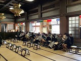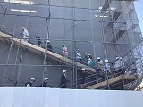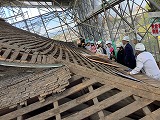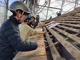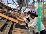 6年生が代表して、甚目寺南大門保存修理工事を見学しました。40年に一度の修理だそうです。グループに分かれて屋根上に上がり、構造や工事の説明を聞いたり、実際に屋根に触れたりしました。釘の代わりに「竹釘」が使われていること、へびのおもちゃが鳩除けに置かれていることなどを知り、驚いていました。境内を散策したり本堂の見学をしたりして重要文化財をより身近に感じるよい機会となりました。