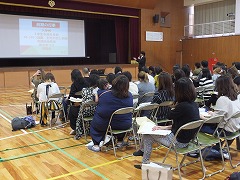 検査と並行して体育館では、保護者の方に入学説明会を行いました。特に一番上のお子さんが入学する時は、期待と不安で一杯だと思います。甚目寺小学校のことや子供たちの様子を知っていただくことで、少しは安心をしていただけたのかなと思います。
