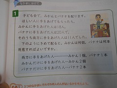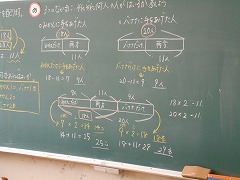 普通は、写真右側の黒板に示された解答例ように、みかんだけの子、バナナだけの子、両方の子の人数を求めてから、必要なみかんの数とバナナの数を求めます。自分でもそうします。というか、この考え方しか思いつきませんでした。