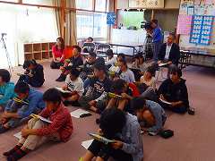 10月12日(水)3限、甚目寺小学校和室にて、人権擁護委員の皆さんが作った小笠原登博士の紙芝居が初披露されました。円周寺住職の小笠原英司様も来校され、6年生の小笠原登博士の調査隊の児童等といっしょにご覧になられました。紙芝居は20分ほどで、その後は小グループに分かれての感想交流会、そして全体発表会が行われました。クローバーテレビが取材されましたので、この様子はクローバーテレビで放送されます。