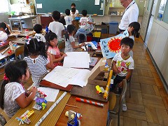 9月2日(金)3時間目に校内を回っていたら、1年生と2年生が夏休みの宿題を展示していて、作品鑑賞会を開いているのを発見しました。思わずカメラでパチリ!夏休みのそれぞれ工夫された友達の作品を見て勉強している子、自分の作品を説明している子などいてそれぞれの作品に込めた思いを味わっていました。2学期始めらしい授業風景でした。
