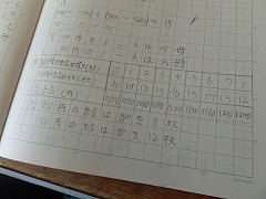 子供たちのノートを見ていると表に書く子、式だけでできる子などいろいろです。大切なことは、できることから手をこまねいていないで考えることです。「例えば・・・」と具体的に考えたり、順番に考えたり、図や表にしたり、簡単な場合で考えたりとさまざまな引き出しをもっていることが大切です。わからない子も友達に聞きながら、どの子もみんな一生懸命に取り組んでいました。解けていた子にどう考えたか説明してもらったら、ちゃんと説明してくれました。しっかり理解できています。わからない問題がやっと解けたときの達成感をみんなに味わってほしいです。