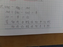 今日は、6年生で「変わり方を調べて」という学習をしていました。50円と80円の絵はがきを合わせて20枚買って、1240円払うときのそれぞれの枚数を求める問題です。中学生になれば、xyを使った文字式で簡単に解ける問題ですが、小学校の段階では具体的な場合を表に書きながら、変わり方の法則を見つけて解いていきます。