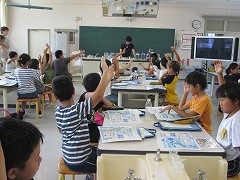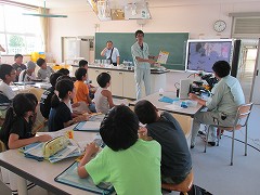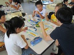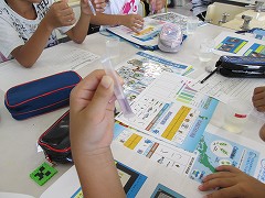 4年生の夏休み環境学習、第3回目は下水道についてです。わたしたちが使って汚した水は、下水処理場で微生物の力を使ってきれいにしています。まずそのことに、子どもたちはとても驚いていました。また、わたしたちが水をどのくらい汚しているのか、実際に水質検査を行って確かめました。透明に見える少量のジュースを溶かした水が、生き物にとってはとても暮らしにくい水になっていることがパックテストの色の比較で、子どもたちもよく分かったようです。