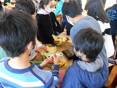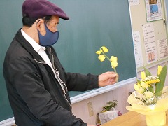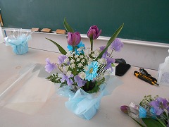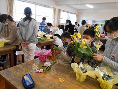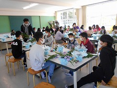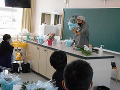 甚目寺のほうかえんの方にお越し頂き、6年生が2つの組に分かれ、家庭科室と図工室でフラワーアレンジメントの講習を受けました。卒業式の会場に彩りをそえる花として飾り、式後に保護者の方にお持ち帰りをしていただくことになっています。