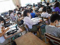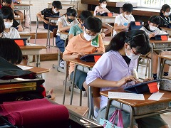 4時間目に校内を巡りました。5年生は書写の時間でした。書写というより「書道」といいたいような、ぴんと背筋を伸ばして、精神を集中させて取り組んでいました。とてもよい顔です。音楽室では、タブレットを使って作曲をしていました。音楽科では緊急事態宣言下で学習活動に制約が多い中、工夫して音楽の楽しさを味わわせていました。今なら、楽器演奏はできなくても、作曲できそうです。3年生は、それぞれが自分のペースで違う課題に取り組んでいました。「個別最適化な学び」が求められています。個のペースで、みんなが黙々と課題に取り組んでいました。