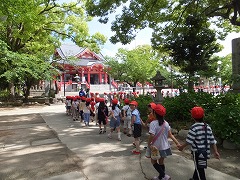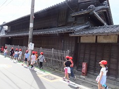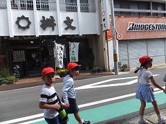 1年生105名で町たんけんに出かけました。今日は、観音様を横切って、校区の東を行くコースです。昔からの古い町並み残っている地域で、歴史を感じさせるお店もたくさん並んでいました。車の通りも多く、せまい道でしたが、右側通行を守って、2列にきちんと並んで歩けました。