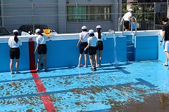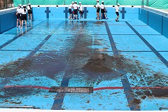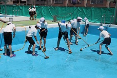 15日のプール開きに備え、朝から6年生のみなさんがクラスごとにプール掃除に取り組みました。昨年、一昨年と水泳の授業が中止になったものの、昨年度の卒業生が掃除をしておいてくれたので、順調に作業が進みました。お昼には、見違えるほどきれいになりました。6年生のみなさん、ありがとうございました。