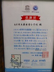 夏休み前からこつこつ準備をし、世界寺子屋運動の一環として、学習会を通してリーフレット作成を行い、全校から書き損じはがき集め、ユネスコ協会に届けました。この活動に対して感謝状をいただきました。校長先生から、「この感謝状には、たくさんの国の言葉で『ありがとう』が書いてあるよ。ぜひ、見てくださいね」とお話がありました。甚目寺小学校は、地域のことをしっかりと学ぶ学習を進めています。この書き損じはがき運動や、リサイクル運動なども、身近なことからできる国際貢献です。こういった小さなことを大切に、今後も続けていってほしいと思います。