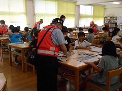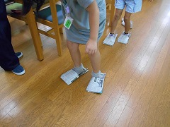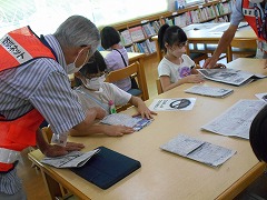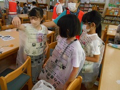 今日は、3年生があま市防災ネットの方をお招きし、防災学習をしました。2時間目から1クラスずつ図書室で行いました。7名の方にお越しいただき、班に一人ずつ付いて、丁寧にやさしく教えていただきました。最初に新聞紙を使って、避難用のスリッパを作りました。次にごみ袋をはさみで切って、簡易な雨合羽をつくりました。最後にけがをした際の応急処置をサランラップと簡単なそえぎ用の段ボール紙で2人1組になって学習しました。