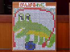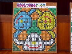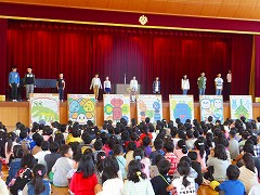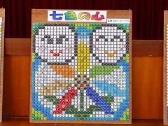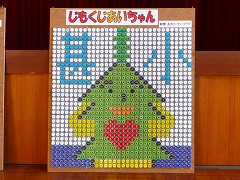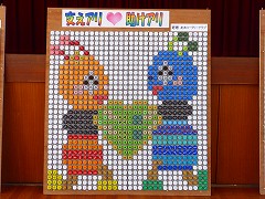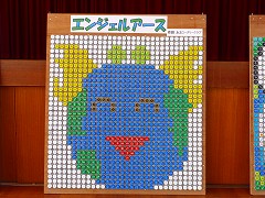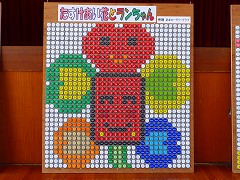 本年度のエコキャップアートの披露式が行われました。各学年が学年目標にあったキャラクターを考え、協力して集めたペットボトルキャップを使ってエコキャップアートとして仕上げました。式では、学年の代表児童がそれぞれのキャラクターを紹介し、完成したエコキャップアートをみんなの前で披露しました。今回も力作ぞろいです。