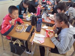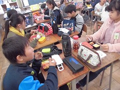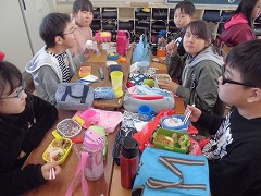 6年生は今日、自分で作った弁当を持って登校してきました。この日のために前日から準備していた子や、いつもより何時間も早く起きた子もいたようです。お互いの弁当を見せ合いながら、「おいしそうだね」「どうやって作ったの?」と楽しそうに話す子ども達。今日の取り組みについての感想の中には、お家の方や食べ物への感謝の言葉がたくさん見られました。
