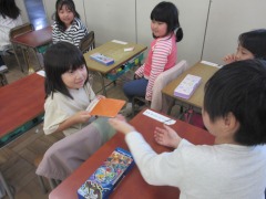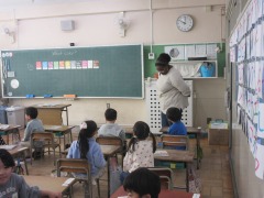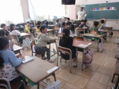 ”What color ?  It's ~." 1年生の教室から元気のよい声が聞こえてきました。今日は、いろいろな色の発音をALTより学び、簡単な会話をかわしたり、色探しゲームや伝言ゲーム、ぬり絵などを楽しんだりしました。楽しそうに取り組む子どもたちの姿を見ていて、中学年から始まる外国語活動につながるとよいなあと思いました。