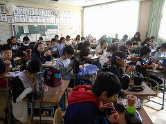 例年なら、グループになって互いにつくってきた弁当を見せ合いながら、わいわい、がやがやおしゃべりしながら食べるところですが、今年は感染防止のため給食の時間は、みんな前を見て、私語なしで食べることになっています。心の中での会話を楽しみながらおいしく食べていたようです。これをきっかけにして、自分の食するものを栄養のバランスを考えながら、自分でも作れるようになってほしいと思います。