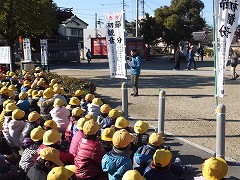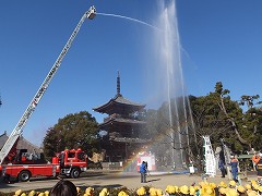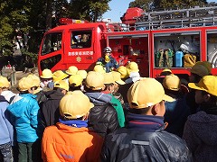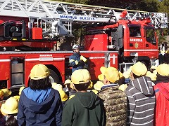 1月26日は文化財防火デーでした。あま市でも重要文化財が多い甚目寺観音で消火訓練が行われ、甚小の4.・5年生とたんぽぽ学級の児童が見学しました。静かに訓練を見ていた児童でしたが、はしご車からの放水の時には大きな歓声をあげていました。訓練のあとには消防車とはしご車の見学をし、消防署員の方の説明を熱心に聞いていました。
