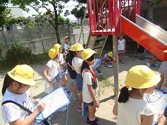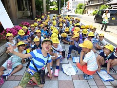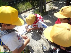 今回のまち探検は、聖徳保育園や歴史資料館などのある南コースを探検しました。西コースとは違い、民家が密集し、細い道が多いコースです。総合学習のテーマである「みんなにとってのやさしい工夫」はどこにあるのか、子どもたちは一生懸命探しています。