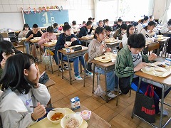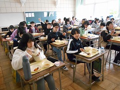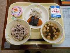 小学校での最後の給食です。今日は卒業をお祝いして赤飯でした。給食放送の卒業の歌にじんと来ました。