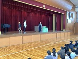 児童会役員の公約『甚ちゃん満腹大作戦』(児童会が制作した甚ちゃんに空き缶を集める)や学校生活をよりよくしたいと考えた生活委員会の『生活ビンゴ』(12/8~)についての呼びかけがありました。寸劇を交えた活動紹介は、全校の興味を引いたようです。空き缶は来週集めますので、今から集めておいてくださいとのお願いでした。