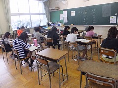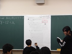 算数は積み上げの教科です。今日2年生の教室では九九の3の段、4の段の学習をしていました。6年生の教室では、速さを求める問題に挑戦していました。表からA駅からC駅までにかかった時間(分)と距離(km)を読みとり、時速を求める問題でした。分を時間に直し、分数のわり算ができないと解けません。5年生は帯分数を含む異分母分数のたし算を学習していました。けっこう難しい問題でしたが、みんな真剣に取り組んでいました。