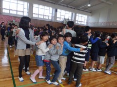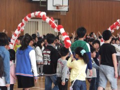 6年生に手を引かれながら入場した1年生。最初に校歌をいっしょに歌い、その後、児童会が考えてくれた「甚目寺小もの知りクイズ」「じゃんけん列車」をしました。最後に、2年生からあさがおの種を、5年生からは一人ずつにメダルを、児童会からは「甚小なかよし宣言」をプレゼントされ、とてもうれしそうでした。