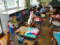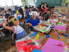 2年生は、図画工作で、材料の組み合わせを工夫しながら、頭にかぶれる飾りを作っています。