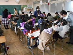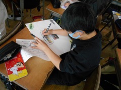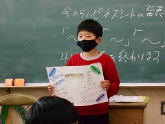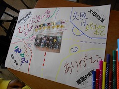 5時間目は、ハピネスシートづくりです。一人ひとりが、「私は~です。」「大切な言葉」「感謝の言葉」「甚目寺小学校の一員として」というテーマでそれぞれの思いを1枚のシートに書き込んでいきました。その時の約束は、絶対にマイナスの言葉を使わないということです。必ずプラスの言葉で自分の思いを紹介し、日頃から口にする言葉を「楽しい」「おもしろそう」「ありがとう」などの前向きなプラス言葉にしていこうという取り組みです。6時間目にはそれぞれができあがったハッピーシートの紹介をしました。「大切な言葉」は、みんなそれぞれ素敵な言葉をかっこよく紹介していました。「感謝の言葉」は「ありがとう」が多かったです。ハッピートークの出前授業は今年も2回目になります。前回もそうでしたが、この時間は、みんなが自然に笑顔となり、とてもよい表情になります。