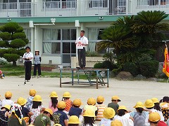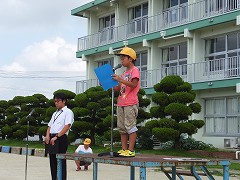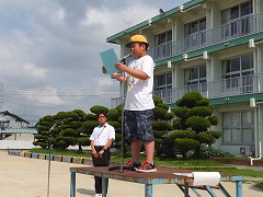 体育館工事のため運動場で終業式を行いました。セミの鳴き声、真夏の太陽、少しの風を感じながらの式でした。1学期の振り返りとして、「聴く=耳+目+心」と「協力=力+力+力」という2種類の足し算はどれくらいできたか、そして振り返りをもとにめあてをもった生活をめざそうと話をしました。また、児童代表として3年生と6年生の児童から1学期の振り返りの発表がありました。式後、夏休みの生活の心構えとして、自分自身への「心配」と自分の周りへの「心配り」をしようという呼びかけがありました。充実した夏休みとなることを祈ります。