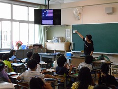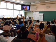 ハッピートーク朝礼の2回目、北海道とつながりました。今日は、か行の早口言葉を練習した後、”笑顔は伝染する”という話を聞きました。