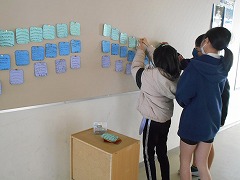朝から強風に小雪が舞うようなとても寒い一日でした。それでも、休み時間になると、半ズボンでがんばっている子もいました。子供は風の子です。児童会の子が「ハッピーレインボーワード」という企画で、友達のよいところ見付けを書いたカードを貼っていました。いろいろなことを意欲的にやってくれています。