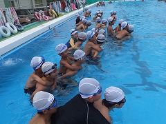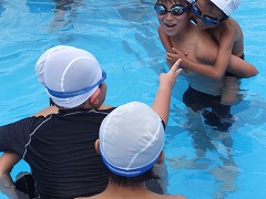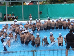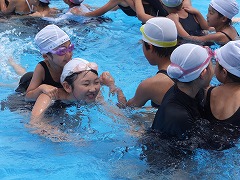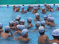 3・4時間目、プールではなかよしプールが行われていました。1年生と6年生の交流です。6年生に背負われて、いつもは入れない深いプールを体験できたり、浅いプールではじゃんけん列車で1年生と6年生が一緒になって大きな輪をつくったりしました。プールサイドは笑顔と歓声があふれていました。