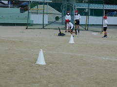 ポールの上に置いた止まったボールを打って、打った子は三角に走っていました。守りの子も直接ボールを受けたり、1塁へ送球するわけではありません。ルールがよくわからず、近くの子に聞くと、ボールを持った子が近くのコーンをさわるまでに、打った子がどこまで回ったかで、得点が入るという話でした。
