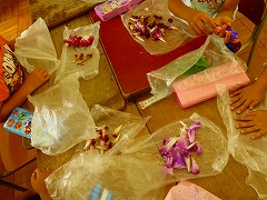 生活科で育てたあさがおが、花を咲かせました。その花を残そうと、少しの水で花や葉をしぼり、紙を染めました。しぼる作業が大変で、子どもたちは手をあさがお色に染めながら、ビニール越しに一生懸命あさがおをしぼっていました。