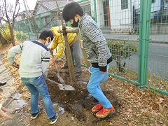 津島人権擁護委員協議会より桜の木を2本、記念品として全校児童にえんぴつとファイルをいただきました。桜の木は、記念碑と共に体育館南側に6年生の代表児童4名に植えてもらいました。学校の西側の道からもご覧頂けます。今度来校した際にさがしてみてください。順調に大きく育ってほしいと思います。