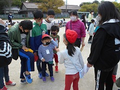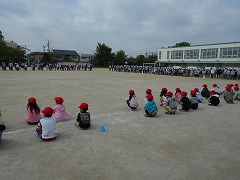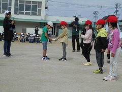 最初に、校歌を2年生~6年生の子に教えてもらい、甚小のことを知ってもらうクイズを行いました。そして、定番のじゃんけん列車をしましたが、今年は肩をつなぐのではなく、赤白帽子を間にはさんでじゅずのように連なりながら、1回の人数を少なくするために3回に分けて行いました。1年生も多くの上級生の子と触れ合うことができました。