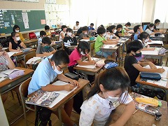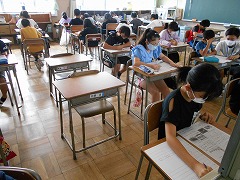 今年から変えたことの一つに、社会科のテストを先生方に自作していただいたことがあります。理由はいくつかあります。まず、メリットとして、テスト購入費がかかりません。紙代とインク代だけで済みます。2つ目は、テストを作りながら、先生方が単元での大切なポイントを確認できます。そして、一番大きな理由は、学習指導要領が変わって、単に知識や技能のみでなく、思考力・判断力・表現力を付けることが重視されるようになったのですが、業者のテストだと、記号で答えたり、簡単な語句を問う問題が多く、これまでとほとんど変わりませんでした。先生方が自作すると、社会事象の理由や関連など、授業で教えた内容を児童に記述で答えさせる問題が増えました。本当に身に付けさせたい力を評価できるようになったと思います。これまでのようにだれでも簡単に90点以上をとれてしまうことがなくなりましたが、逆に言えば今年のテストで90点以上がとれれば、本当に力があると言えます。