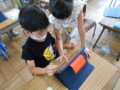1年生が今日もタブレットを一人1台使って、授業をしていました。タブレットの授業だと児童が自然に教え合いを行います。できている子とまだできない子がわかりやすいし、なんといっても、みんなに置いていかれたくないので、まだの子が一生けん命聞くことが大きいと思います。他の授業でも、学び合いの授業が成立するためには、わからない子が、遠りょや恥ずかしさを乗りこえ、しっかり質問できるようにすることがポイントだと感じました。