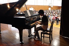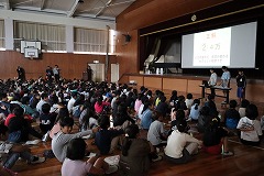 その後、明日行われるユネスコスクール報告会の練習を兼ねて、全校児童の前で、児童会の代表の子に発表をしてもらいました。みんなも興味があるのか静かに集中して聞いていました。発表もばっちりできました。
