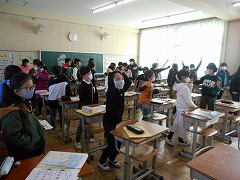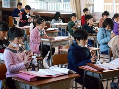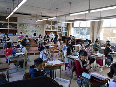 校長室にも、ときどき音楽室からの歌声やリコーダーの演奏が聞こえてきます。そんな時、コロナ禍の中ですが、学校が休校にならずよいなと感じます。今、音楽室では、できるだけ間隔がとれるように机を配置しています。リコーダーを演奏する際にも、飛まつが飛ばないよう、リコーダーの先を布で縛っています。歌もマスクをして、時間を制限しながら歌っています。隣の英語教室では教師からの英語での指示に合わせて、体を使って反応する学習をしていました。こんな風に自然に英語に親しんでいくのだなと感じました。みんな楽しそうでした。