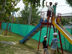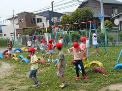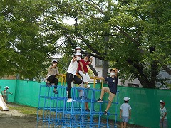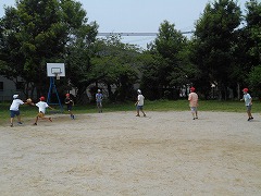 水泳の授業のない曜日は、たっぷり遊べる時間があるので、子ども達には概ね好評です。ドッジボール、サッカー、バスケ、ジャングルジム、登り棒、一輪車、ブランコなど、思い思いの場所で、思い思いの遊びを、暑さも忘れて興じている姿は、とても子供らしくて良いなと感じます。熱中症予防のため、外遊び中はマスクをとるように声かけしていますが、とらない子が多いです。汗を一杯かいて引き上げてくる子からは、やっと気づいたように「あー疲れた。暑い!」という声も聞かれます。