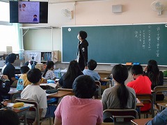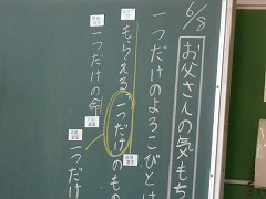 4年生が国語科の授業で「一つの花」という教材を学習していました。「ひとつだけちょうだい」という言葉に込められた思いについて学ぶ授業でした。父親の思いと母親の思いとの違いなどを比べながら読みを深めていました。また、6年生では、書き言葉と話し言葉の違いを考える授業をしていました。どちらも言葉に対する感覚が磨かれていく授業でした。