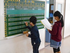学級や学校が円滑に運営されていくために、多くの仕事をみんなで分担してうけ負っています。朝の出欠黒板への記入にくる保健係さん、ノートなどを配る配達係さん、朝の歌のCDを準備する係の子、体育館のかぎを取りに来る体育係、さまざまです。毎時間の授業始まり・終わりの号令や黒板をきれいにするのは多くのクラスで日直当番が順番に行っています。委員会でもさまざまな仕事をしてくれています。子ども達はみんな係や当番、委員会の仕事が大好きです。きっと自分が体を動かすことで、周りの人に役立っていることをうれしく感じているのだと思います。人に喜ばれることを、自分の喜びとできることは、幸せへの近道です。