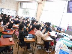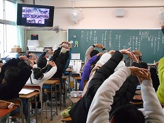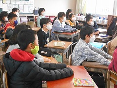 波照間小の子達から、「学校にプールがなくて、いつも海で水泳教室を行っている」との紹介があると、「水泳教室、自分達もやってみたい」と、自然に声が上がりました。初対面の他校との交流で、緊張感の中にも、自然と笑顔が広がり、これまでのどの回よりも気持ちのよい朝になれたように思いました。学校自慢もクラスごとにそれぞれの特徴が感じられ、楽しかったです。