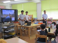 4年生の夏休み環境学習、最終日は福田川の調査です。学習にあたり、「福田川をきれいにする会」として活動して見える後藤さん、山本さん、堀部さんにお越しいただき、福田川の様子や、活動についてうかがいました。福田川をきれいにする会の方々が見せて下さった、こんな福田川を目指したいというイラストは、子どもたちの心にとても強く残ったようです。